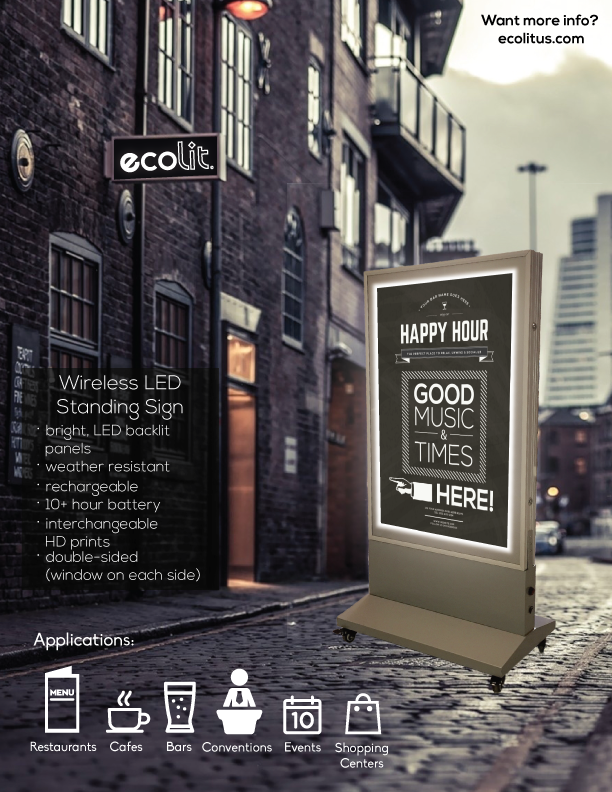 Ecolit designed a revolutionary new product that can be used in a multitude of applications. It is a double-sided LED light box that is weather proof, rechargeable, and comes on a wheeled stand. Essentially, it is a mobile light box that can be placed on your sidewalk in front of a restaurant or retail venue, inside of a shopping center, at a convention, or even at an event such as a wedding banquet. The uses are limitless. Since the standing light box is battery operated you can bring it with you anywhere. On a single 4-5 hour charge it stays brightly lit for 10+ hours. You also have the option of keeping it plugged in if necessary. Swapping out the photo quality prints are simple with the un-lockable doors on both sides.